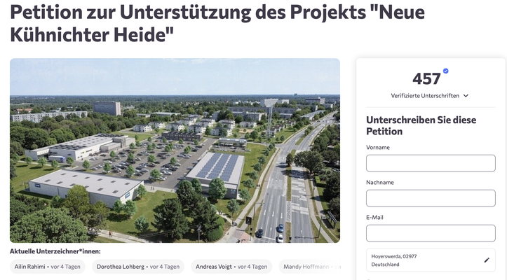 Am 31.07.25 starteten die Fraktionen von CDU, SPD, Linke und Freie Wähler eine Petition zur Unterstützung des Projekts "Neue Kühnichter Heide". Diese Petition ist hier zu finden: https://chng.it/Drzwx7ntz5